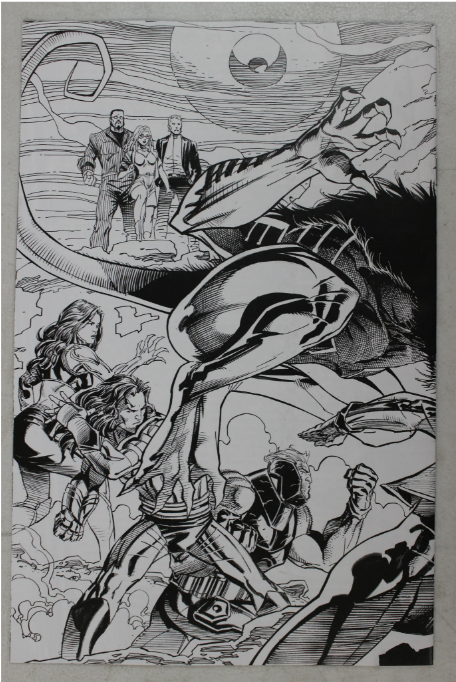 Comic book-style illustration with characters and a creature in a dynamic pose.